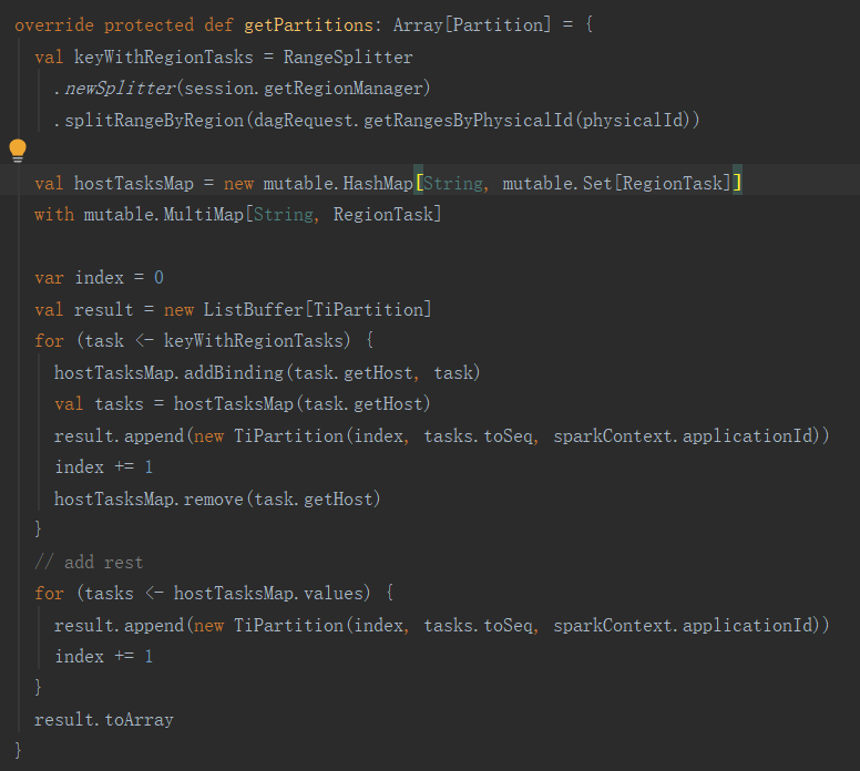 首先通过splitRangeByRegion获取keyWithRegionTasks, 对于每一个RegionTask创建一个TiPartition。