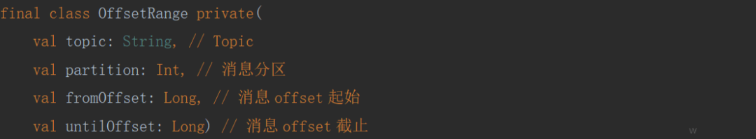 它会根据从初始化时接收的offset信息参数,生成KafkaRDDPartition分区;每个分区对应着Kafka的一个topic partition 的一段数据,这段数据的信息OffsetRange表示, 它保存了数据的位置。