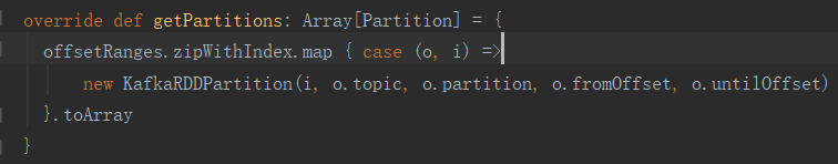 Partition的计算方法是为topic的每一个partition创建一个OffsetRange,所有的OffsetRange生成一个KafkaRDD。
