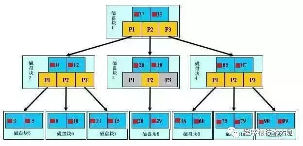 浅蓝色的块我们称之为一个磁盘块,可以看到每个磁盘块包含几个数据项(深蓝色所示)和指针(黄色所示),如磁盘块1包含数据项17和35,包含指针P1、P2、P3,P1表示小于17的磁盘块,P2表示在17和35之间的磁盘块,P3表示大于35的磁盘块。真实的数据存在于叶子节点即3、5、9、10、13、15、28、29、36、60、75、79、90、99。