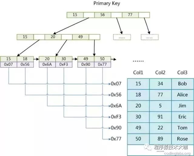 这里设表一共有三列,假设我们以Col1为主键,则上图便是一个MyISAM表的主索引(Primary key)示意图。可以看出MyISAM的索引文件仅仅保存数据记录的地址。在MyISAM中,主索引和辅助索引(Secondary key)在结构上没有任何区别,只是主索引要求key是唯一的,而辅助索引的key可以重复。