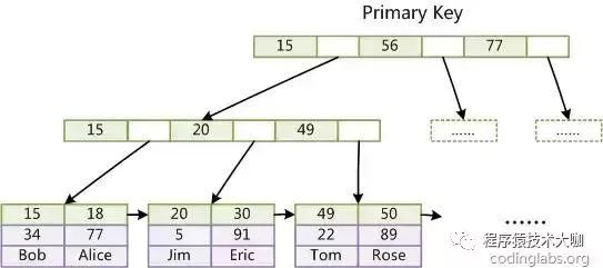 上图是InnoDB主索引(同时也是数据文件)的示意图,可以看到叶节点包含了完整的数据记录。这种索引叫做聚集索引。