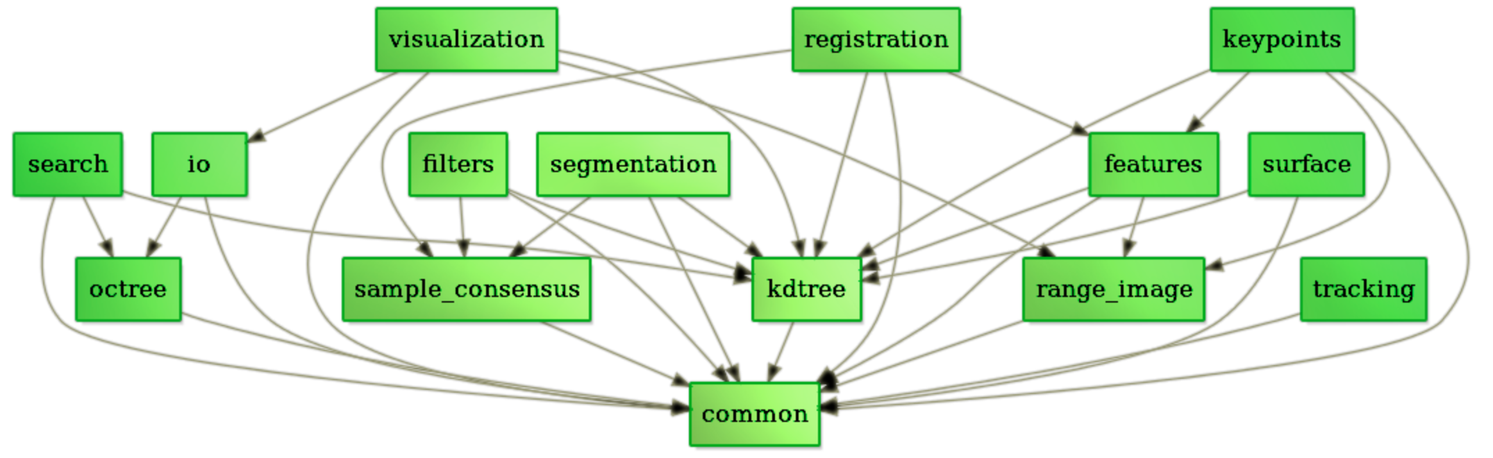 师兄:功能很丰富了,基本PCL的操作都有,比如读写、滤波、特征估计、表面重建、配准、分割等等,你看这个图就是PCL的功能啦
