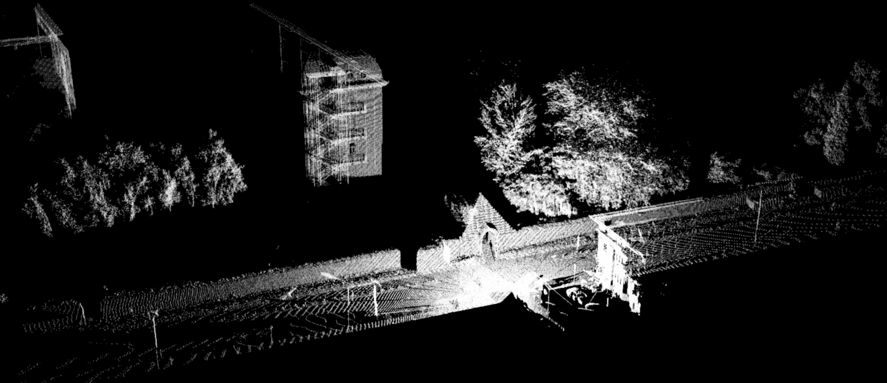 师兄:想要直观一点的话,我直接给你看点云图吧,你看下面就是室外一个街道的点云图,远看能看清房子,树木的轮廓啊