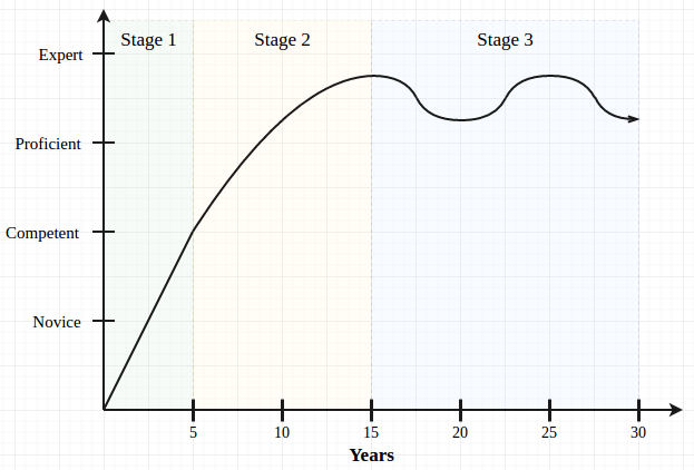 2016年,国外一位40岁“老”程序员在一次演讲——Reflections of an 'Old Programmer' (“老程序员”的思考)中提到了技术人员不得不面临的一些“灰犀牛”。首先他将一个程序员的职业生涯做了如下的阶段划分: