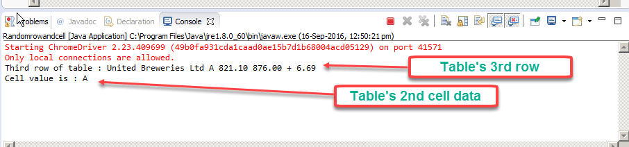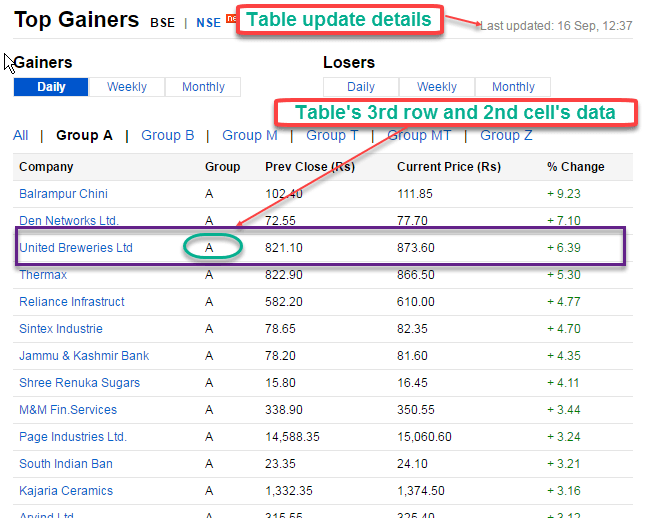 In above table, data is regularly updated after some span of time. The data you try retrieve will be different from the above screenshot. However, the code remains the same. Here is sample program to get the 3rd row and 2nd column's data.