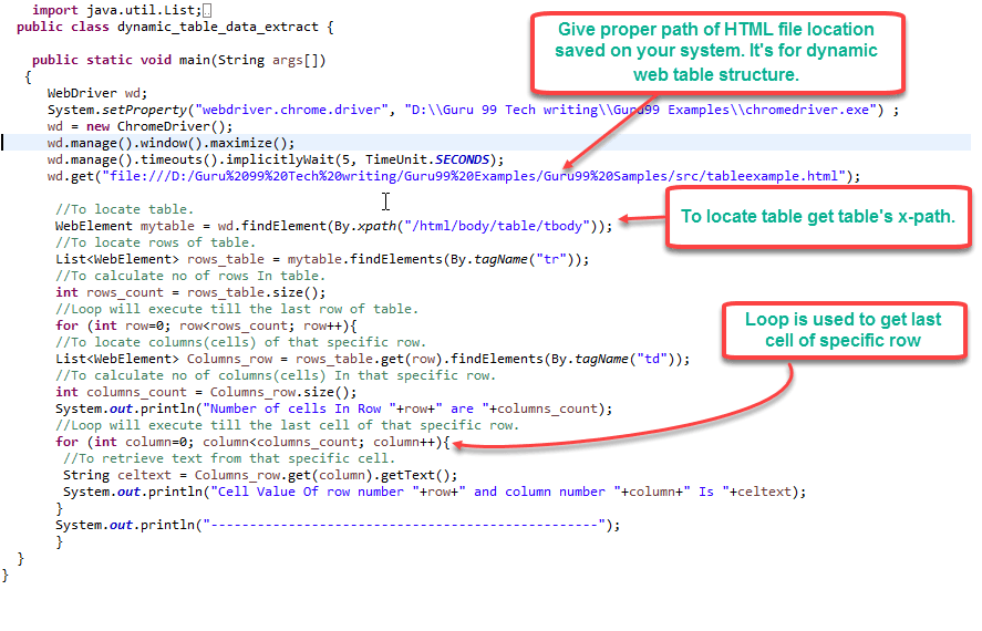 - for each row we get the total number of columns using rows_table.get(row).findElements(By.tagName("td"));