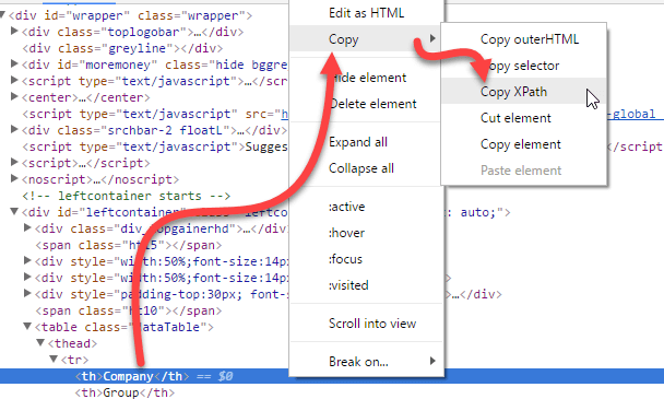 Step 4) Use the copied X-path "//*[@id="leftcontainer"]/table/thead/tr/th [1]" in Selenium WebDriver to locate the element.