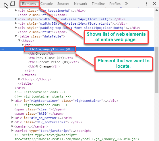 Step 2) Right click on web element whose x-path is to be fetched. In our case, right click on "Company" Select Inspect option. The following screen will be shown -