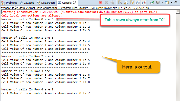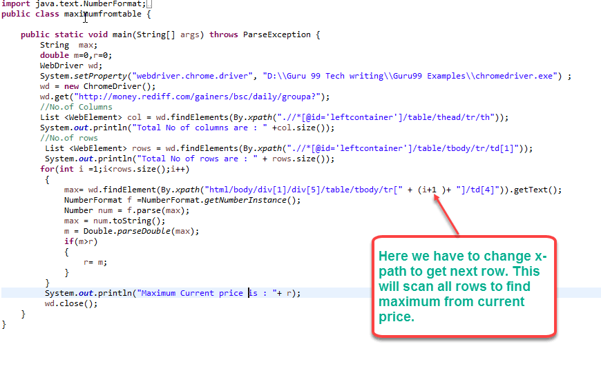 - Using for loop, we iterate through total number of rows and fetch values one by one. To get next row we use (i+1) in XPath