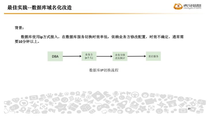 之前的数据库是用 IP 方式接入的,在数据库切换的时候,需要通知每个业务方修改配置,重启服务,这样就带来一个问题:整个过程是不可控的,取决于业务方的响应速度,生效时间通常超过十分钟。