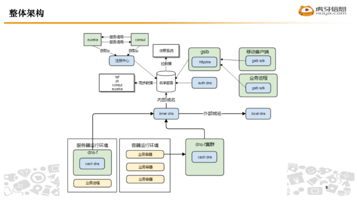 在这个过程中, DNS解析是天然的分布式架构,每一层都会有缓存,上一层出现问题挂掉,下一层都会有缓存进行容灾。另外,整个 DNS 协议支持面广,包括手机和 PC,我们用的编程框架里也有 DNS 解析器,服务器也会配 DNS 解析引擎,因此,DNS 在虎牙的基础设施中是很重要的部分。