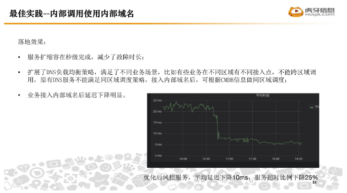 第三,业务在接入内部域名之后,延迟会有明显的下降。上图显示的就是某个服务在接入到内部域名之后,延迟出现明显的下降。