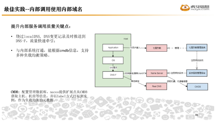 如果想要提升内部服务调用质量,一是 DNS 记录变更绕过 LocalDNS,把 DNS 的记录变更直接推到 DNS-F。二是与内部系统打通,从 CMDB 等内部系统获取机器信息,支持多种负载均衡策略。