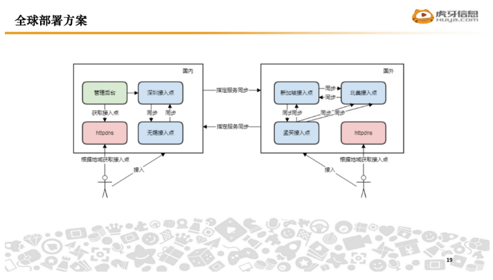 这是虎牙的一个全球化的部署方案,我们在全球部署了两个大区,分别是国内和国外。这两个大区是指定服务同步的,走的是专线,这样可以保障同步的稳定性。在一个大区内我们又部署了多个接入点,例如在国内大区,我们部署了深圳和无锡两个接入点,这两个节点的数据是互相同步、互为备份,保证在一个集群挂掉下可以切换到另外一个集群。
