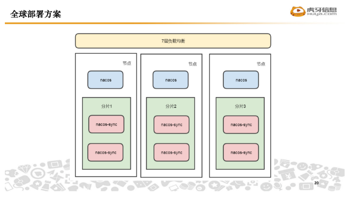 单个集群部署了多个 Nacos 节点,并通过7层负载均衡的方式暴露给外面使用,并且提供了多个 VIP,满足不同线路和区域的接入要求。同时,Nacos Sync 做了分片处理,将同步压力分散到各个分片上,一个分片下我们又部署了多个 Nacos Sync 的节点,以保障多活和高可用。