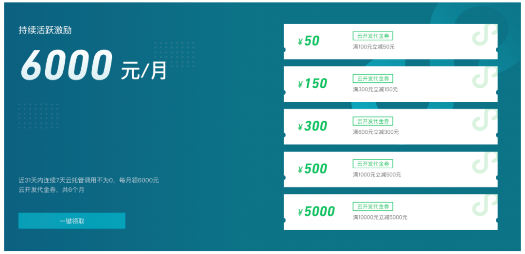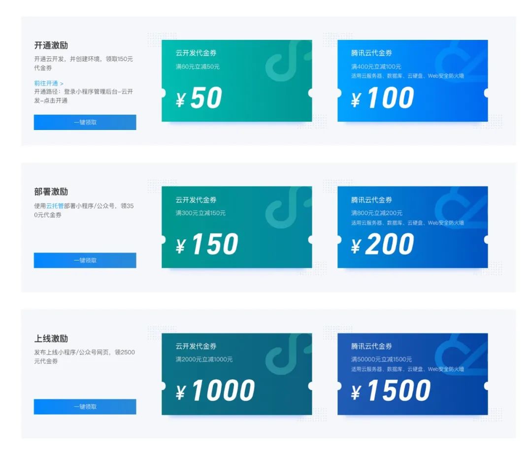 对企业产品从开通、部署到上线的整个研发生命周期进行扶持:使用云开发即送3000元代金券,包括腾讯云代金券和云开发专属代金券(详见下图)。