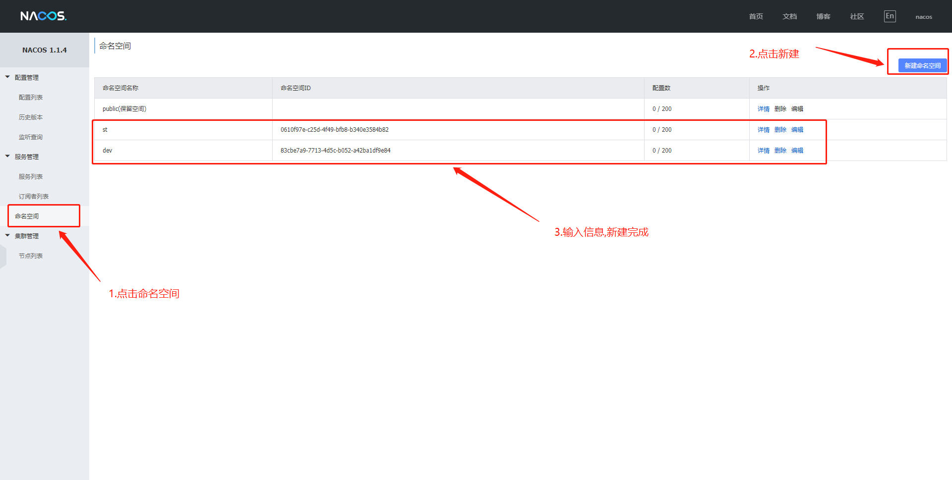 打开我们的nacos的页面,点击命名空间,新建,输入信息即可。
