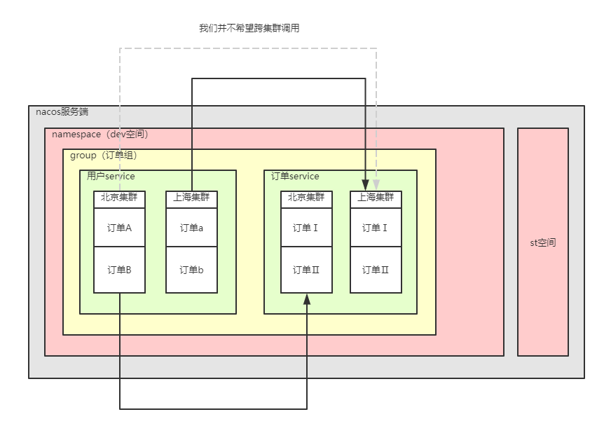就是什么呢,我们现在有两组集群,一个是北京的订单服务集群,一个是北京的用户服务集群,还有一个上海的订单服务集群,我们希望北京的用户集群,优先去调用北京的订单系统,上海的优先调用上海的集群服务。并不希望我们跨地区远程调用(如果组内实在没有服务了,也可以调用,但是优先考虑同一集群的)。配置文件如下所示