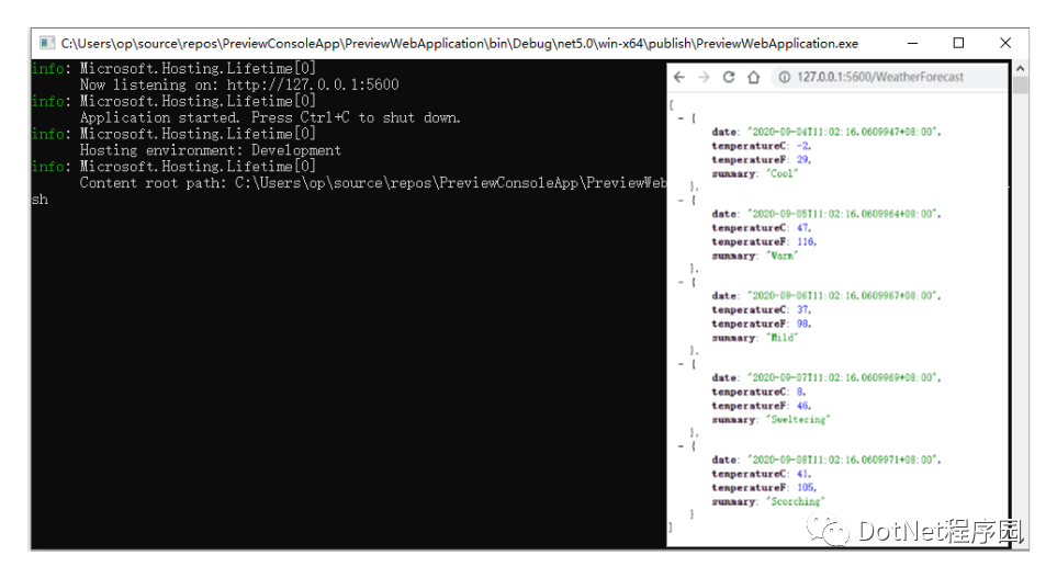 打包后的程序和未打包的发布程序在运行方式上没有太多的差异性,在 Windows 平台上,只需要双击 PreviewWebApplication.exe 就可以运行该打包程序了,本示例创建的是一个 WebApi 的程序,直接访问程序侦听的地址后得到接口返回的结果,如果您创建的是带有 Razor 视图或者携带其它资源文件的,可能无法访问指定的 url。
