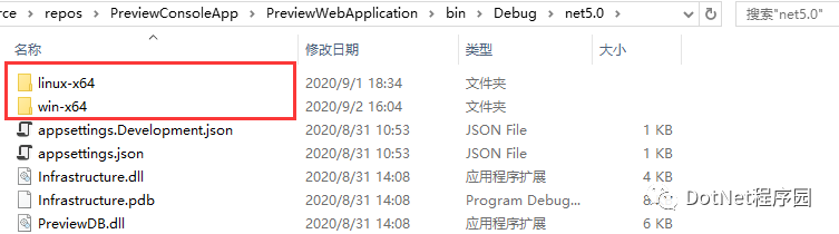 linux-x64 和 win-x64 两个目录下,分别有 publish 目录,由于平台的不同,所引用的依赖也不一样,这是我们早就了解过的,我们看看打包前后的区别