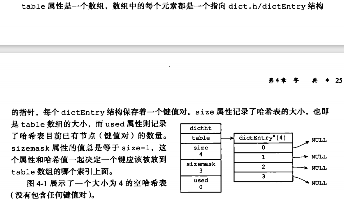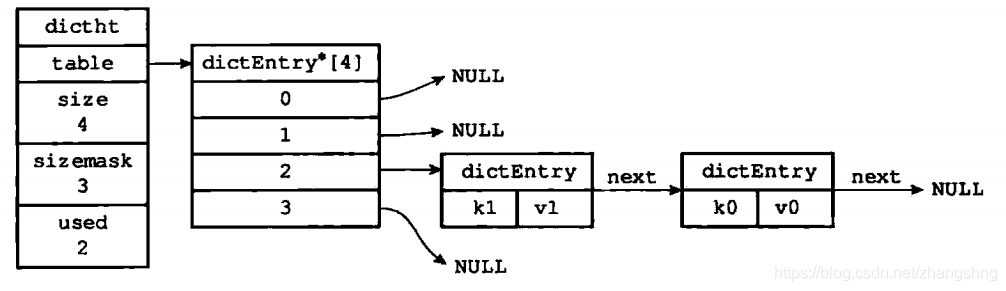 table:哈希表数组.数组中的每个元素都是一个指向dictEntry结构的指针,每个dictEntry结构保存着一个键值对