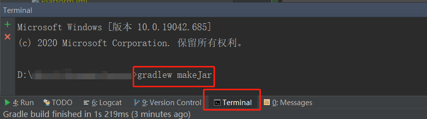 3.点击AS最下面的Terminal,用命令行执行任务,在命令行输入 gradlew makeJar,这样需要出jar包的module就会成功出jar包.