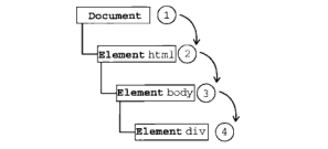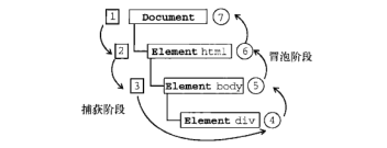 看得出, document对象最新接收事件,然后沿DOM树依次向下,直到最后的实际目标 <div>元素,如图展示了捕获过程: