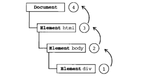 由此可见,元素绑定的事件会通过DOM树向上传播,每层节点都会发生,直到 document对象,如图展示了冒泡过程: