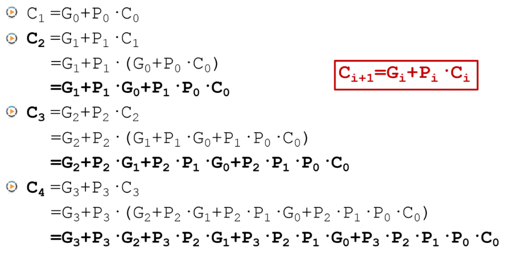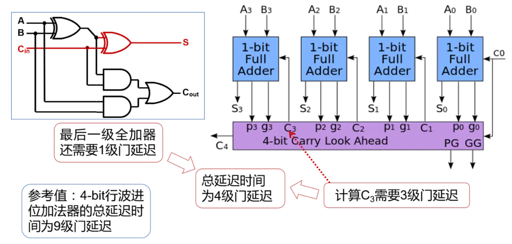 单bit全加器的输出改为输出P、G和S,而每一级的进位可以有下方的逻辑得到。因此最终延迟为4个门。