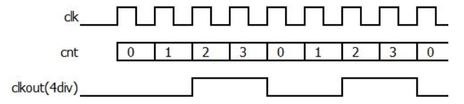 上图的的分频系数是4,就是4分频。电路原理是用一个上升沿计数的计数器,每次计数到2时输出信号clkout翻转一次,每次计数到4时clkout再翻转一次,一直周期重复下去。其他的偶数分频器原理也是一样。