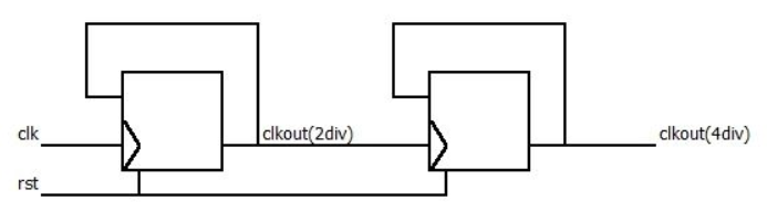 如果偶数分频系数是2的幂,就可以用2分频器级联得到;例如4分频就是两个2分频级联,下图就是用两个2分频器级联得到4分频器。