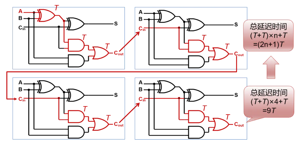 如果将全加器内部打开,我们可以看到,关键路上有9个门,门延迟非常高
