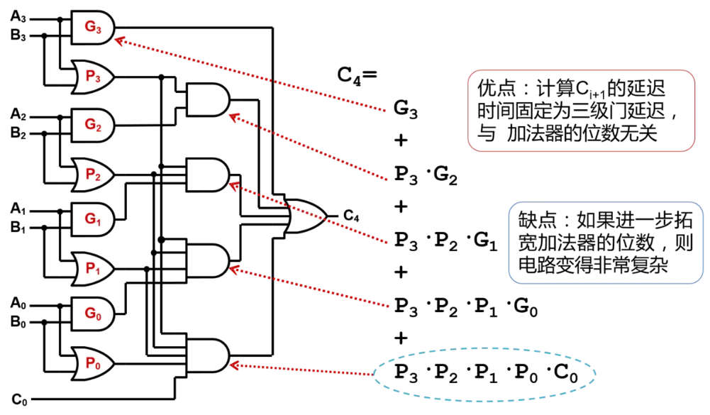 可以看到,每一级的进位都不依赖于上一级的进位,因此不需要等待上一个加法器完成计算,超前得到进位结果。同时,显然如果要实现大位宽加法器,逻辑将会变得更加复杂。