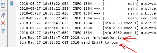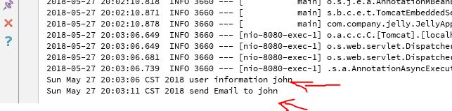 通过上面的例子已经完成了事件监听,但是也存在一些问题,例如假如发送邮件比较耗时,例如上面的例子,花了5秒钟,那么用户就需要等待五秒,才可以接受到返回的信息。看上面的例子,后台保存用户信息时间是18时38分47秒,邮件发送完毕是18时38分52秒,等到用户接到到信息时已经是18时38分52秒了,这样用户体验显然很差。采用异步事件的方式,新建一个线程,将处理事件放到新的线程中,这样就可以显著提高用户的体验。