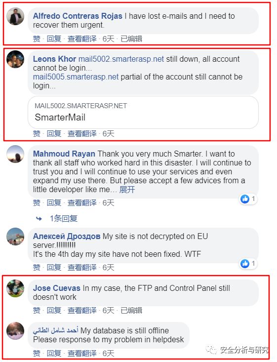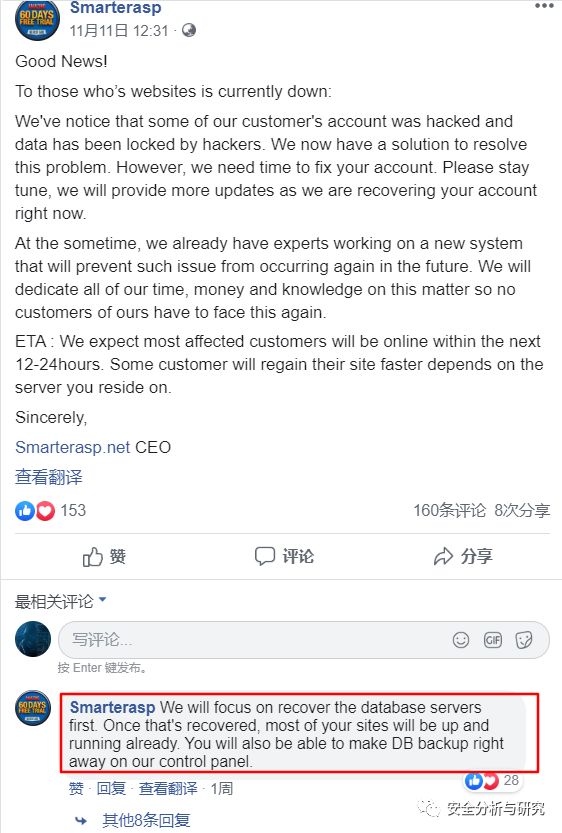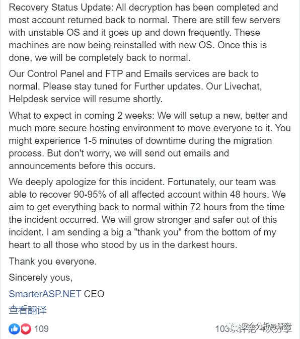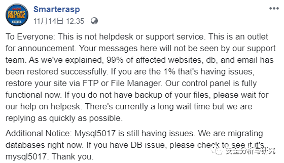 2019年11月11日,ASP.NET在其Facebook上更新了一天关于公司应急响应的一些进展情况,宣称勒索病毒加密的客户帐户和网站数据正在逐渐被解密和恢复,如下所示: