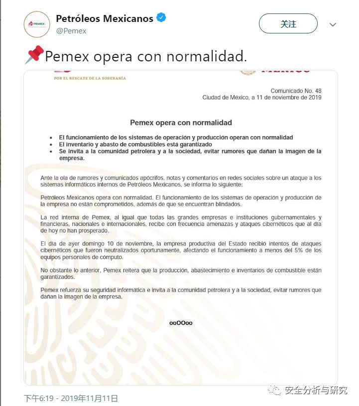 尽管Pemex在twitter上发表了申明,宣称他们的系统正常在运行,公司的运营和生产系统并未受到损害,并受到了保护,改善了其安全性,黑客攻击没有成功,攻击已被及时消除,影响不到5%的个人计算机设备功能,但至少证明此公司成为了黑客攻击的目标之一,如下所示:
