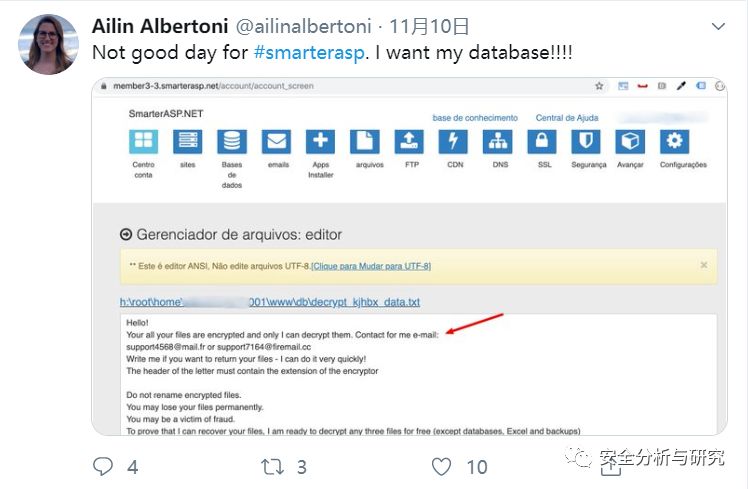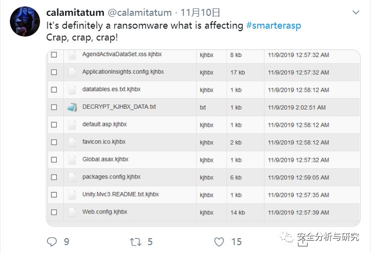 从2019年11月9日被勒索病毒攻击,文件数据被加密,11月9日一整天网站关闭,客户电话也被迫关闭,11月10日才重新上线,然后一直到14日上午发布公告,声称完成了解密工作,99%的网站、数据库,电子邮件完成恢复工作,整个应急响应工作持续了长达一周之久,期间不断有客户在twitter或facebook在吐槽,可以说这次勒索病毒攻击对SmarterASP.NET造成了巨大的影响和损失