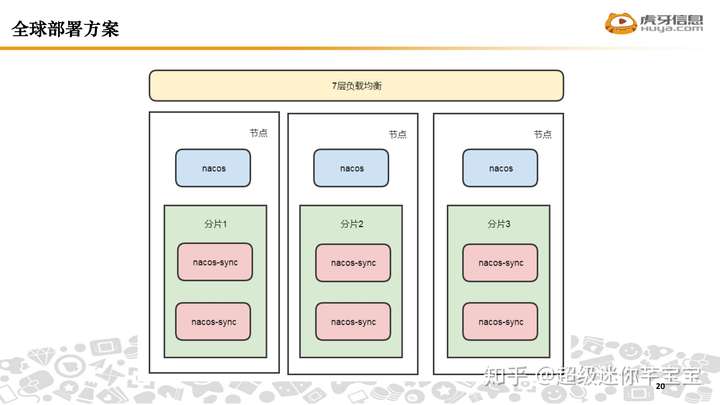 单个集群部署了多个 Nacos 节点,并通过7层负载均衡的方式暴露给外面使用,并且提供了多个 VIP,满足不同线路和区域的接入要求。同时,Nacos Sync 做了分片处理,将同步压力分散到各个分片上,一个分片下我们又部署了多个 Nacos Sync 的节点,以保障多活和高可用。