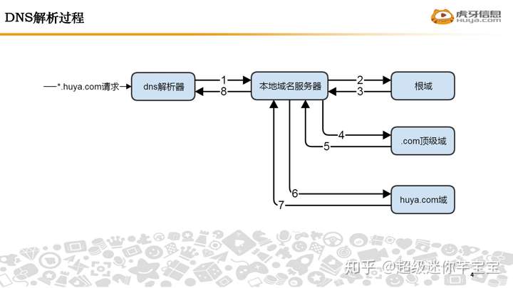 DNS 的解析过程很关键,例如上图中的 DNS 解析器通过一个定位解析追踪到我们的 DNS,再到本地域名服务器迭代解析,经过根域再到.com名,最后到http://huya.com的根域名,获取最终的解析结果。