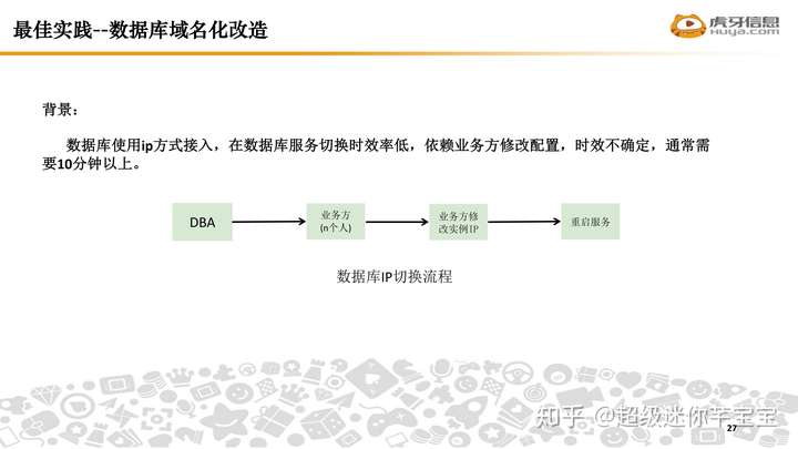 之前的数据库是用 IP 方式接入的,在数据库切换的时候,需要通知每个业务方修改配置,重启服务,这样就带来一个问题:整个过程是不可控的,取决于业务方的响应速度,生效时间通常超过十分钟。