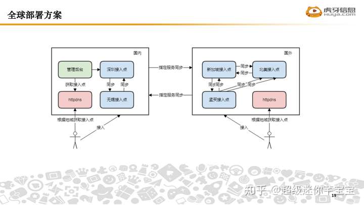 这是虎牙的一个全球化的部署方案,我们在全球部署了两个大区,分别是国内和国外。这两个大区是指定服务同步的,走的是专线,这样可以保障同步的稳定性。在一个大区内我们又部署了多个接入点,例如在国内大区,我们部署了深圳和无锡两个接入点,这两个节点的数据是互相同步、互为备份,保证在一个集群挂掉下可以切换到另外一个集群。