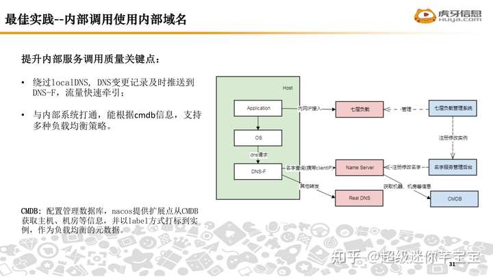 如果想要提升内部服务调用质量,一是 DNS 记录变更绕过 LocalDNS,把 DNS 的记录变更直接推到 DNS-F。二是与内部系统打通,从 CMDB 等内部系统获取机器信息,支持多种负载均衡策略。