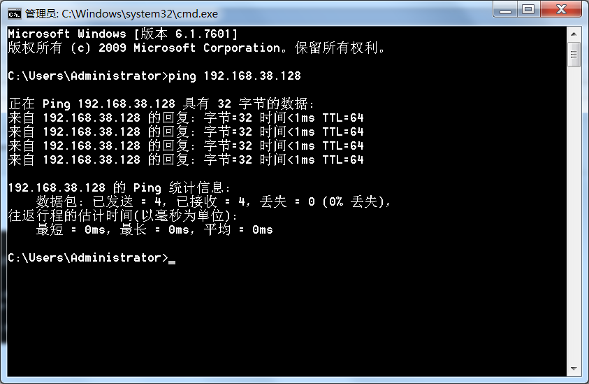 cmd窗口ping 192.168.38.128,出现如下界面说明是可以的