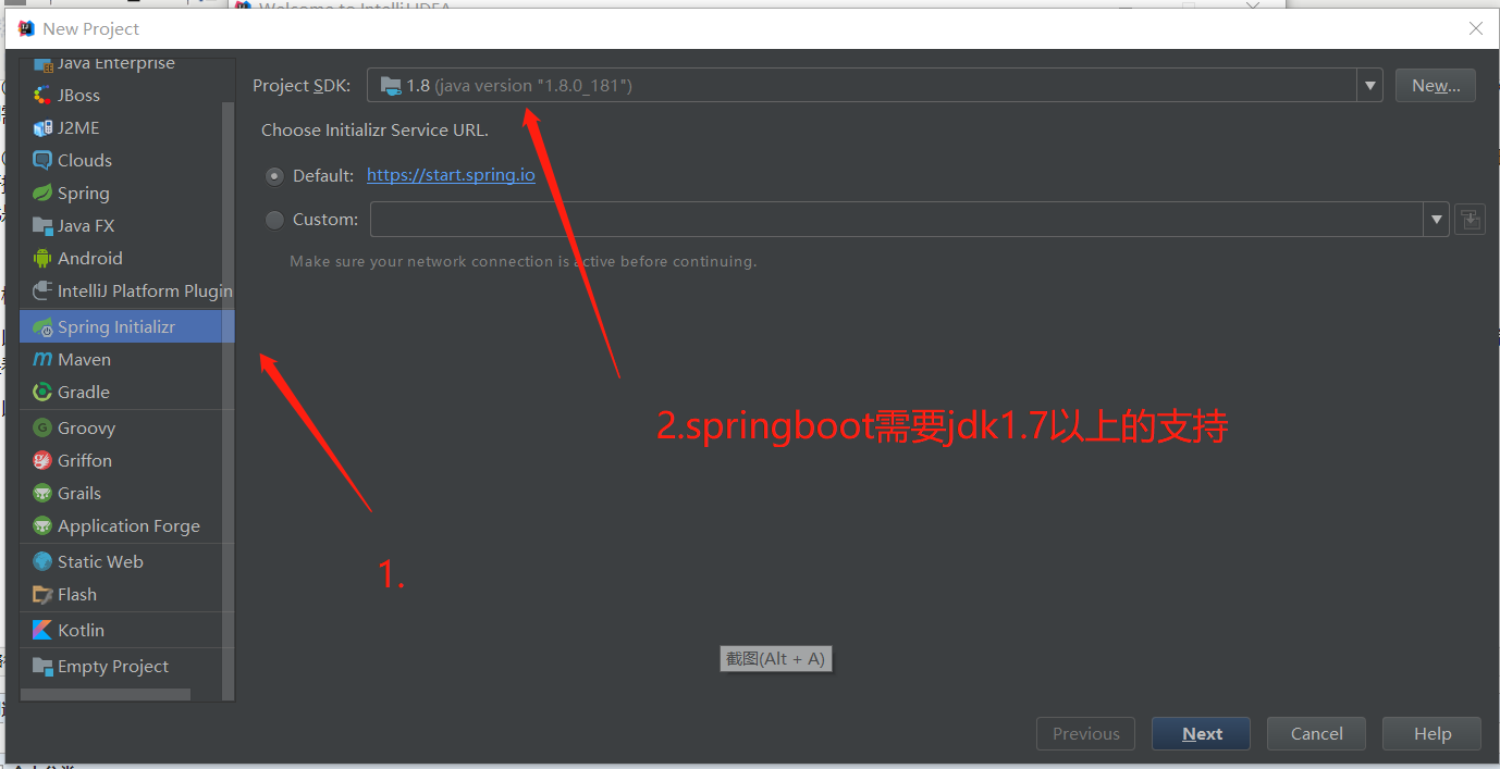 (1)创建一个新项目,选择Spring Initializr(IDEA内嵌的初始化springboot的一个组件开发插件),此过程需要在接入网络下进行,会下载一些依赖