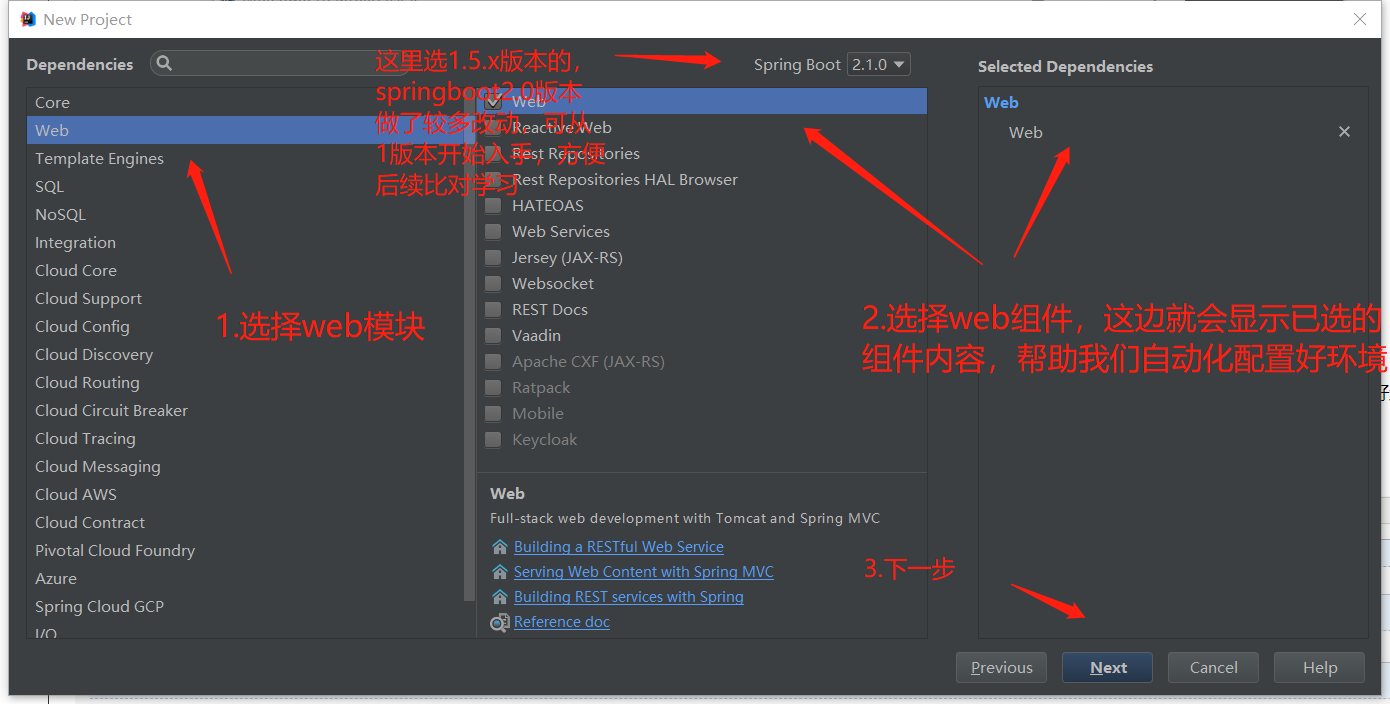 (3)选择所需的模块。可以看到,在这里能选择很多我们想集成的模块(sql\nosql之类),这是springboot自动化配置的强大功能,只要选择模块,就默认帮我们配置好这些模块,现在我们先选择web模