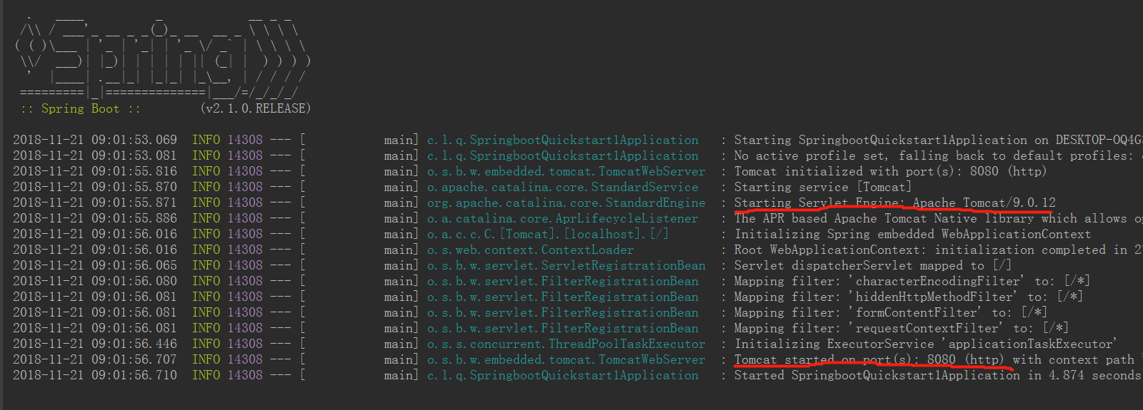 (7)运行 SpringbootQuickstart1Application中的 main方法,即可启动该项目(springboot内嵌了了Tomcat容器,所以不需要手动配置容器,很方便)。启动项目后,访问