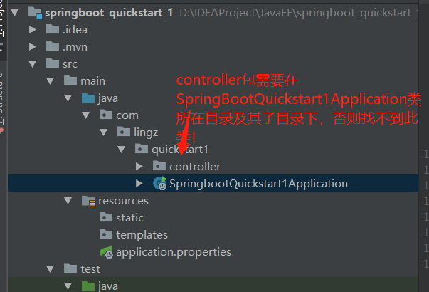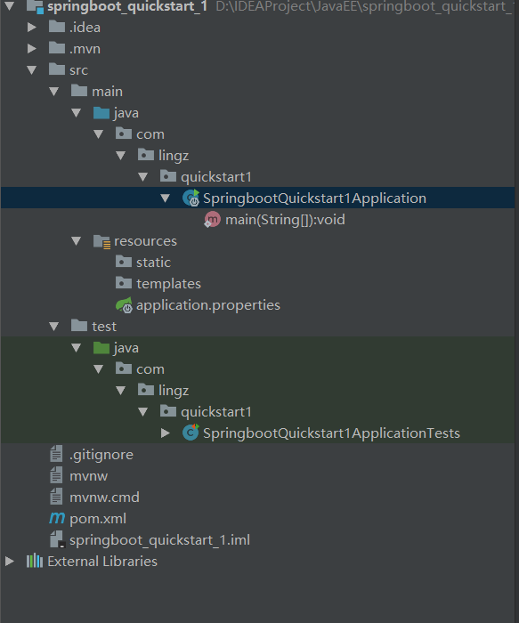 (5)创建完成后,右下角会出现更新提示,允许后会自动配置好springboot的环境,并且项目目录如下,其中的详细后续会解释。现在我们可以看看 SpingbootQuickstart1Application类,其中的main方法就是整个项目启动的入口。springboot内置了Tomcat容器,我们不需要自己配置容器就可运行。