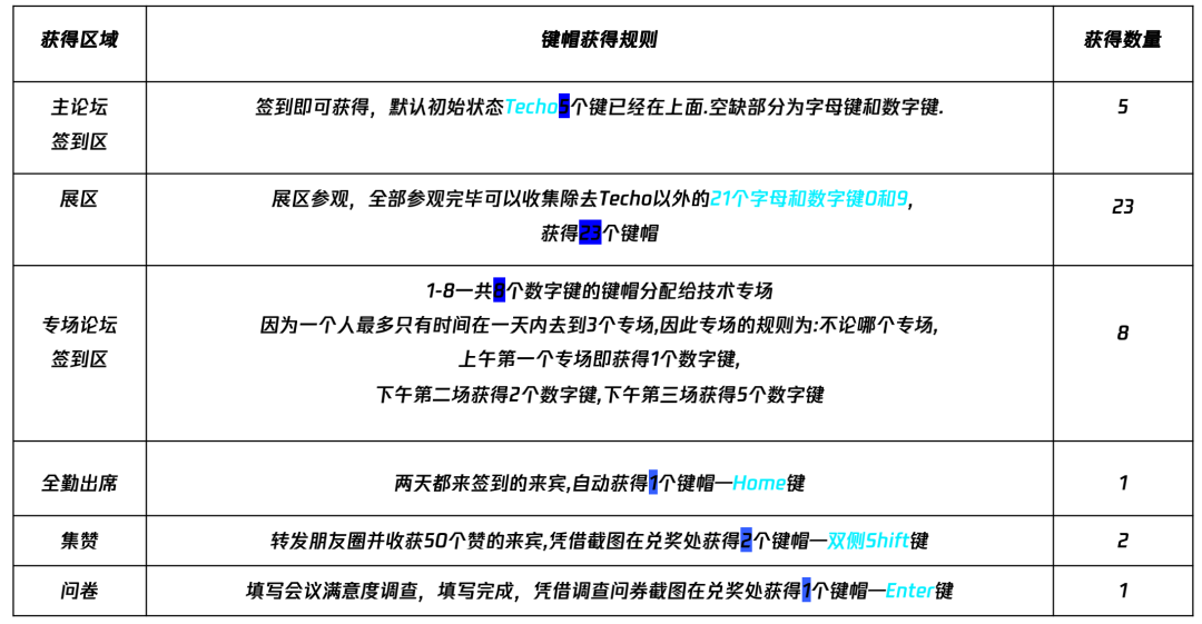 参会期间,每个签到嘉宾签到后,会在小程序开启虚拟键帽搜集游戏,现场的小伙伴可以根据自己搜集键帽的数量去兑换相应的礼品。