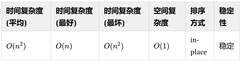 空间复杂度 空间复杂度就是在交换元素时那个临时变量所占的内存空间。最优的空间复杂度就是开始元素顺序已经排好了,则空间复杂度为0;最差的空间复杂度就是开始元素逆序排序了,则空间复杂度为: